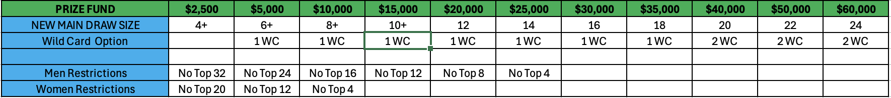 - What ranking level pros can I expect? Player participation varies greatly depending on location of the event and many other factors. Typically, higher prize money events and those that provide hotel and top notch hospitality can expect the highest ranked players. Lower prize money events have some restrictions on which SDA ranked players can participate:• $5,000 Challenger – No top 24 players • $10,000 Challenger – No top 16(men) top 4 (women) players • $15,000 Challenger – No top 12 players • $20,000 – No top 8 players (men) • $25,000 – no top 4 players (men) • $30,000 and higher – No restrictions